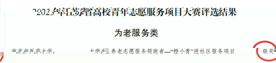 近日,由團省委、省青年志願者協會舉辦的2023年江蘇省高校青年志願服務項目大賽決賽在南京郵電大學圓滿舉行。我院積極響應,主動報名,沖破層層選拔,最終經省級篩選、線上閱評、路演答辯、評審委員會評議等環節的激烈角逐,我院大學生養老志願服務領跑者——“橙小青”進社區服務項目榮獲為老服務類銀獎。“