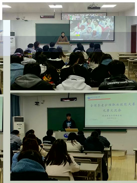12月4日至6日,由民政部、人力資源社會保障部聯合舉辦的全國養老護理職業技能大賽決賽在江蘇省南京市舉行,作為全國首個本科以上學曆教育的伟德线上平台,我院高度重視學生為老服務精神培育、創新創業技能培養,嚴格按照疫情防控要求,積極組織青年師生參與大賽觀摩交流活動。大賽舉辦期間,學院2021級全體新生利用網絡直播平台觀看了我國養老服務領域首次舉辦的競賽規格最高、參與人數最多、技能水平最高、影響力最大的職業技能大賽。觀摩結束後,各班級以宿舍為單位圍繞賽事項目、個人對養老行業認知等開展了形式多樣、内容豐富的交流學習,并結合自身學業生涯規劃、職業發展目标撰寫心得體會,推動大賽觀摩學習走深、走實。