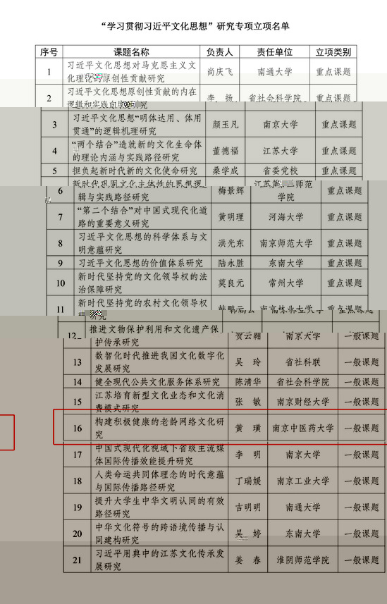 2月23日,江蘇社科規劃網公布《“學習貫徹習近平文化思想”研究專項課題立項名單公示》,我院黃璜老師的“構建積極健康的老齡網絡文化研究”獲立項。