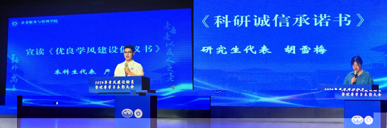 本科生代表嚴可向全院學生發出建設優良學風的倡議,胡雪梅則代表全院研究生做出科研誠信承諾。
