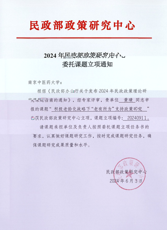 近日,我院黃璜老師申報的積極老齡化戰略下“老有所為”支持政策研究獲2024年民政部政策研究中心委托課題立項。