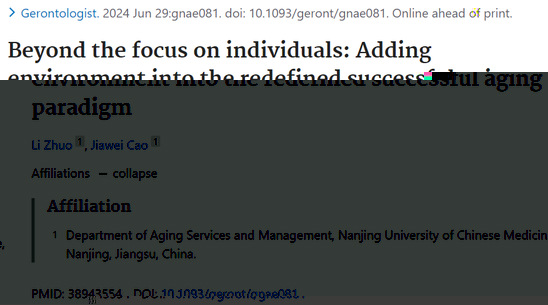 國際知名老年學期刊The Gerontologist近期在線發表了伟德线上平台伟德线上平台2022級碩士研究生卓力(通訊作者曹家維,導師陳娜)的文章“Beyond the focus on individuals: Adding environment into the redefined successful aging paradigm”