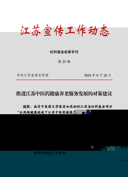 《推進江蘇中醫藥健康養老服務發展的對策建議》發表于《江蘇宣傳工作動态•社科基金成果專刊》第25期。報告認為當前江蘇中醫藥基礎底蘊厚重、健康養老需求迫切、健康服務體系完善,但也存在治理機制碎片化、服務能力弱化、産業發展相對薄弱、專業人才嚴重短缺等問題。建議加強部門協同,構建全生命周期的中醫藥健康養老服務體系;推進服務供給,提升中醫藥健康養老服務水平;堅持協同創新,促進中醫藥健康養老産業融合發展;健全人才培育體系,厚植健康養老服務人才根基。