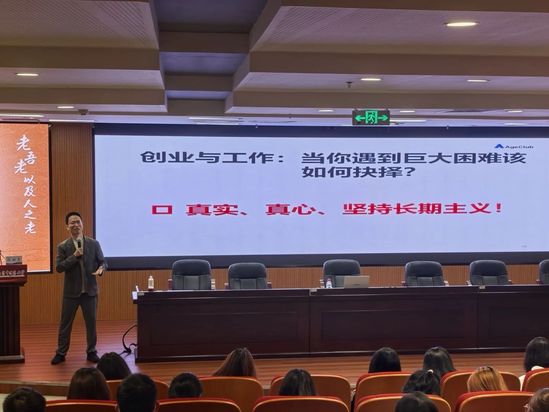 在講座的最後部分,段明傑給予同學們真誠建議。他認為在職業選擇上,未來20年是養老産業持續成長的賽道,機會衆多。他鼓勵大家勇敢探索、堅定方向、持續深耕。在創業與工作方面,他建議在遇到巨大困難時,要保持真實、真心,并持續堅持。