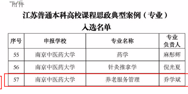 近日,江蘇省高等學校教學管理研究會課程思政建設工作委員會公布了江蘇普通本科高校課程思政典型案例入選名單。我院養老服務管理專業獲此殊榮,成為江蘇高校課程思政典型案例(專業)之一。