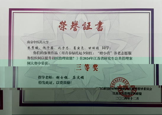12月15日,由江蘇省管理學類研究生教育指導委員會主辦、南京理工大學承辦的2024年江蘇省研究生公共管理案例大賽圓滿落幕。此次競賽共有來自江蘇省22個院校100餘支參賽隊報名參賽,經過層層選拔,我院謝士钰、蘇文娟老師指導的2023級研究生團隊的參賽作品《用青春綠托起夕陽紅:“橙小青”養老志願服務組織何以提升社區治理效能?》榮獲三等獎。這是我院學子首次參與該項賽事。