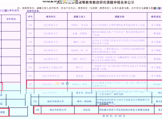 在江蘇省高等教育學會公示的2025年江蘇省高等教育教改研究課題申報名單中,我院劉宏亮教授主持的“體醫融合背景下中醫藥院校以體育人新模式探索”,以及黃璜副教授主持的“新文科視域下養老産業學院‘三融三創’教學管理創新模式研究”成功入選,此次立項充分展現了我院在教育教學改革領域的創新活力和實踐探索精神。
