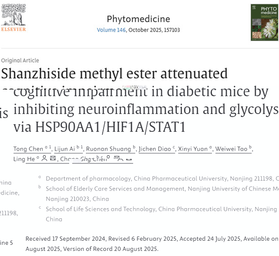 2025年8月,我院陳暢老師與中國藥科大學聯合團隊在國際著名期刊Phytomedicine(中科院1區,IF=8.3)發表題為“Shanzhiside methyl ester attenuated cognitive impairment in diabetic mice by inhibiting neuroinflammation and glycolysis via HSP90AA1/HIF1A/STAT1”的研究論文。