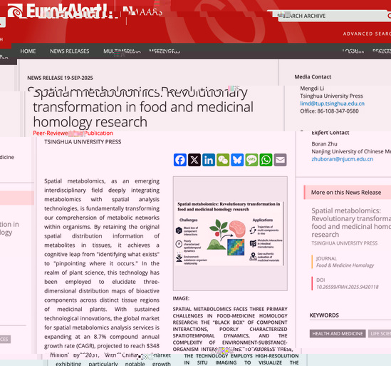 2025年9月19日,我院教師朱博冉獨立一作發表題為《Spatial metabolomics: Revolutionary transformation in food and medicinal homology research》的文章被全球最大科技新聞發布平台優睿科《Eurekalert》報導。