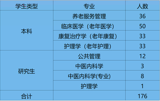 培養目标:培養具有紮實的基礎醫學、臨床醫學基本理論、基本知識和基本技能,一定的公共衛生和預防醫學知識、紮實的老年醫療衛生保健知識和技能、一定的自然科學和人文社會科學知識,具備良好的醫學職業素養、終身學習能力和創新意識及能力,能在綜合性醫院、老年專科醫院、康養機構和醫學科研院所等單位從事醫療、教學、研究工作的複合型人才。