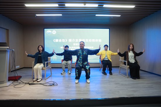 “‘頤’在中國傳統文化中寓意和諧安甯,‘合’則代表協調統一、天人合一,功法由此得名。全套功法共九式,動作貫穿頭腳,兼具舒緩和情緒、愉悅心情之效。”在随後舉行的研讨會上,《頤合功》編創者劉宏亮教授介紹了《頤合功》的編創背景,并在現場帶領與會者進行了功法動作互動微體驗,得到與會者一緻好評。