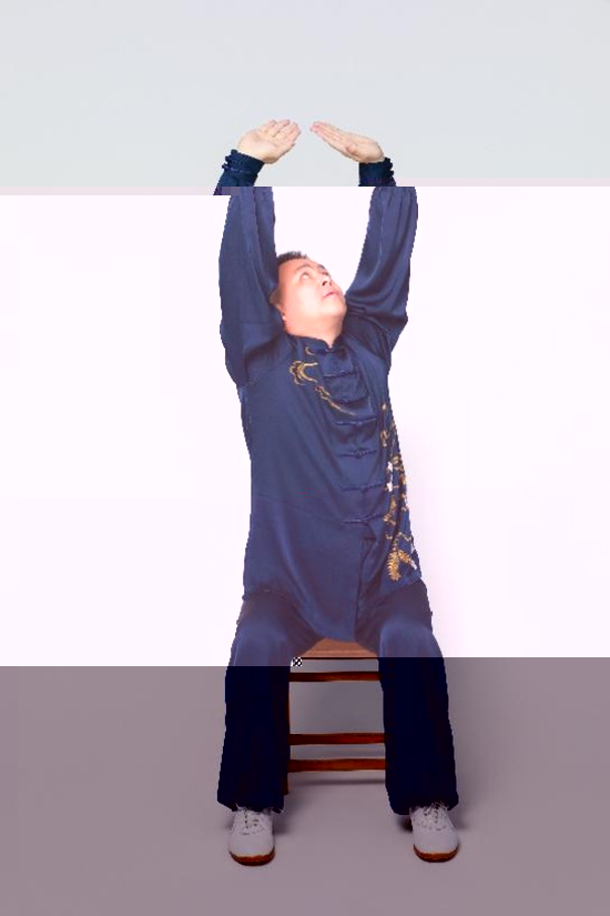 第三式:上撐轉體健脾胃。兩手自體前上舉至頭頂,指尖相對;身體先左轉,目視左手背;再右轉,目視右手背;身體回正,兩臂落下,至腰間握拳。随後,左右方向互換再做一遍。此式通過轉體促進三焦氣機流通,調節頸、胸、腰三段脊椎功能,緩解肌肉緊張,增強背部力量。